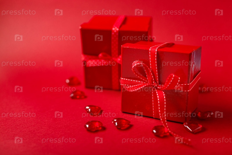 Две красные коробки с подарками и бантами, концепция Дня святого Валентина