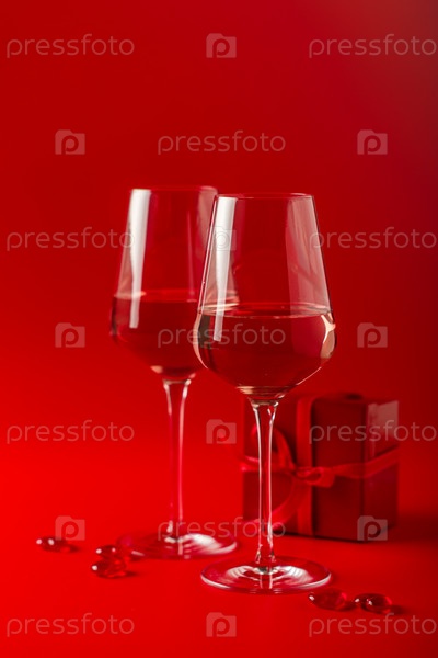 Два полных бокала вина на красном фоне