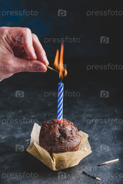 Ручное зажигание свечи на кексе на день рождения
