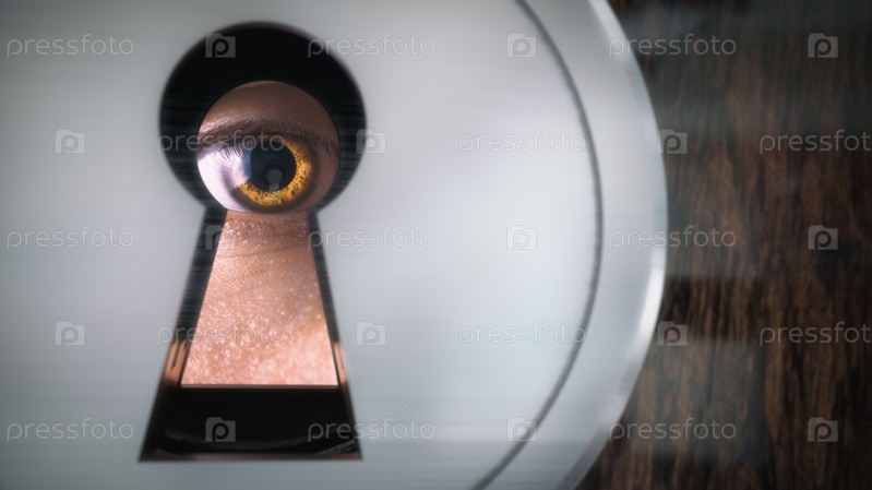 Мужчина смотрит в замочную скважину. Крупный план