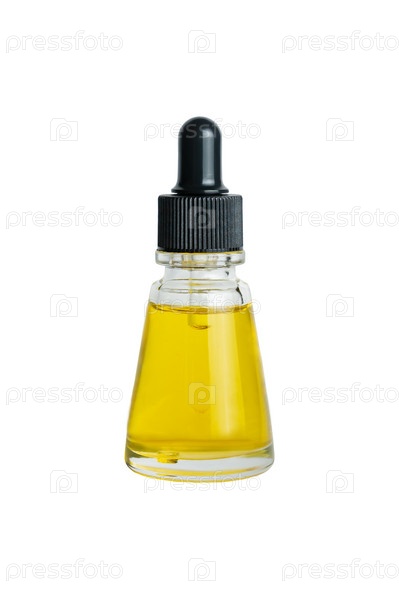 Прозрачная стеклянная бутылка-капельница с черной крышкой, изолированная на белом фоне путем обтравочного контура. Мадицина по уходу за кожей и косметологический макет. Эфирное масло внутри
