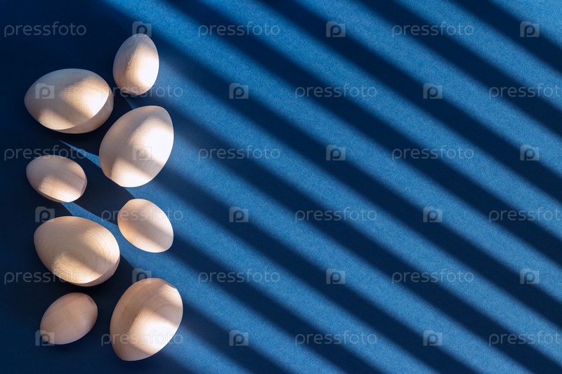 Декоративные деревянные пасхальные яйца. Тени от жалюзи на синем фоне. Концепция счастливой Пасхи. Вид сверху, пространство для копирования