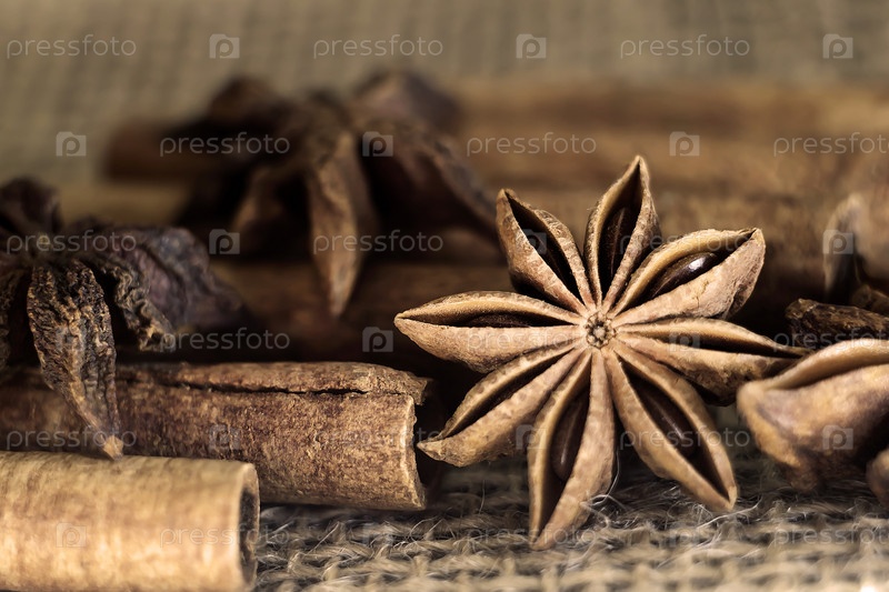 Анис и корица. специи. фото. макро. палочки с корицей и звездный анис на лохмотье ближайшее изображение. фото. macro