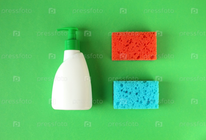 Вид сверху на моющее средство для мытья посуды и цветные губки на зеленом фоне