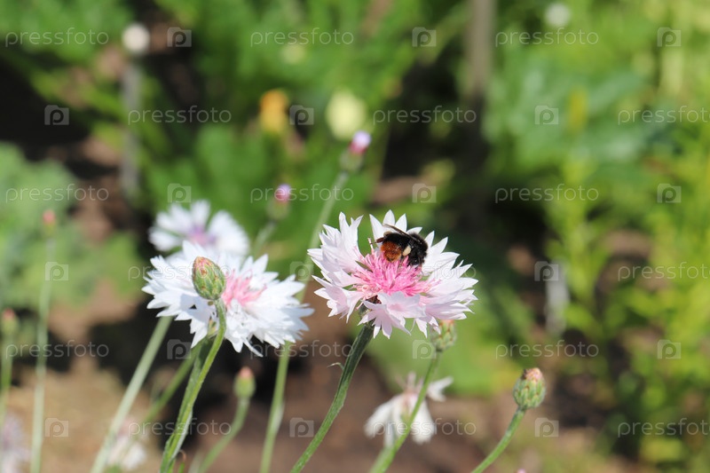 Шмель на белом васильке на лугу