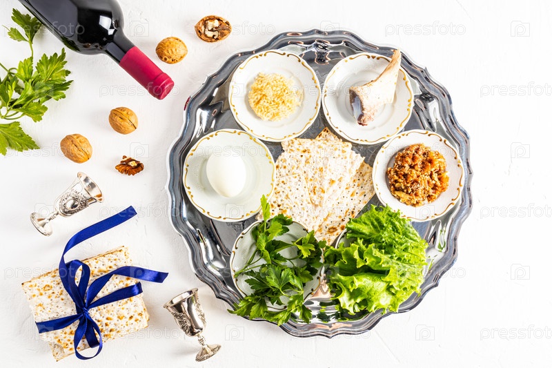Серебряная тарелка с традиционными еврейскими угощениями на Песах. вареное яйцо, листья салата, хрен, кость, орехи и маца. символ еврейской Пасхи