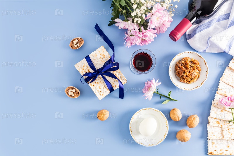 Праздничный фон еврейской Пасхи. традиционные символы и продукты праздника на синем фоне. вид сверху. плоская планировка. пространство для копирования
