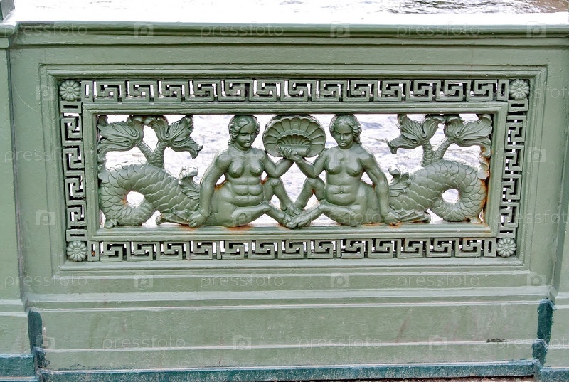 Литая чугунная ограда с барельефами морских коньков и русалок. Аничков мост, Санкт-Петербург