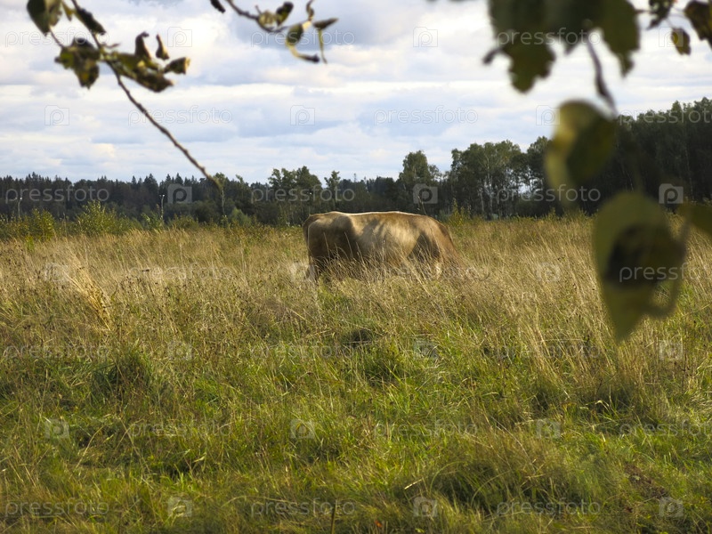 Коричневая корова пасется в поле осенью