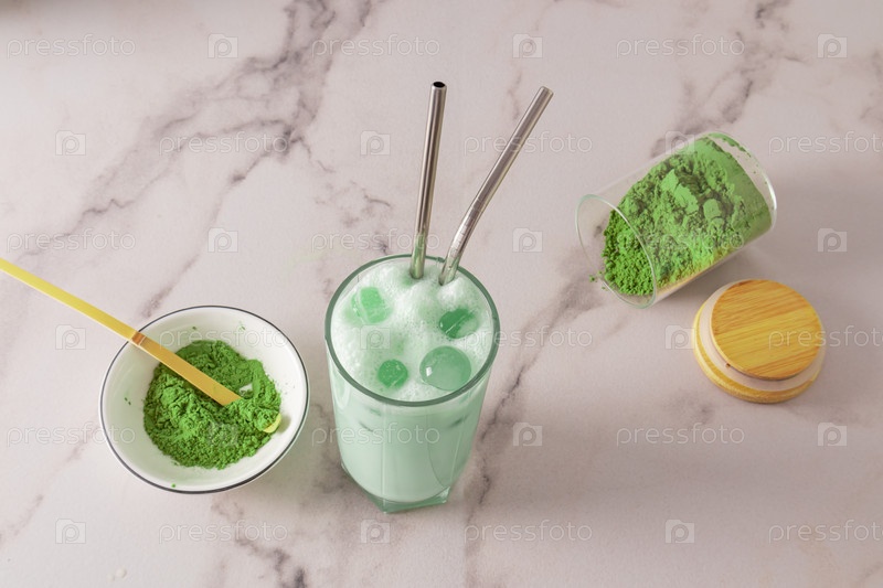 Стакан вкусного здорового безалкогольного напитка в высоком стакане с металлической соломинкой и льдом в форме шара. мощный тоник