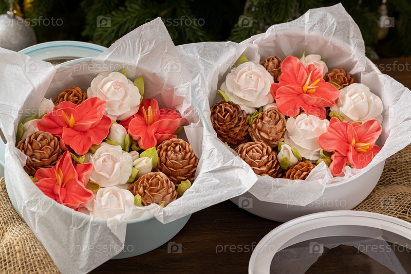 Зефирный букет цветов в подарочной коробке на фоне елки, концепция праздничного настроения