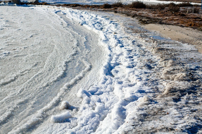 Крупный план ледяного берега, замерзших волн, скал и солнечных бликов на льду