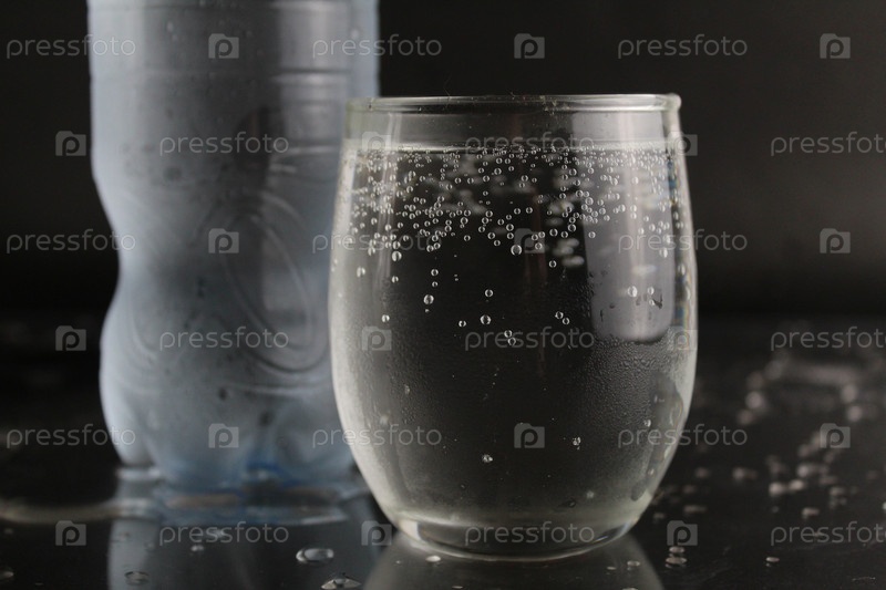 Минеральная холодная вода в стакане и в пластиковой бутылке стоят рядом с черным фоном с местом для вставки и копирайтом. питьевая вода