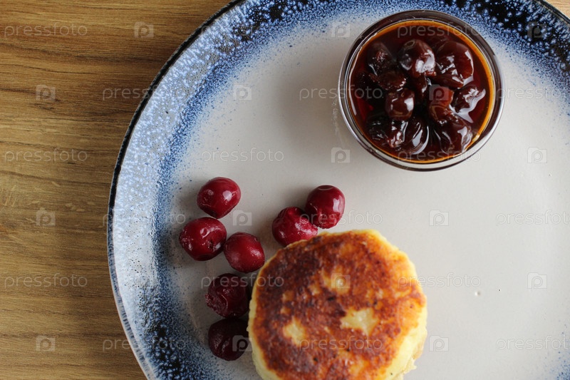Три блинных чизкейка лежат стопкой слайдов друг на друге на тарелке на столе с соусом из вишневого варенья. Вид со стороны. Завтрак русский украинский. Блюда и творог. Место для текста и с копирайтом