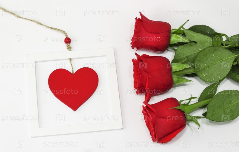 Композиция фона на День святого Валентина. Красное сердце в белой рамке и красные розы на белом фоне. Копировать пространство