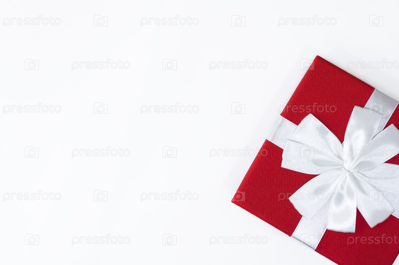 Красная подарочная коробка с белым бантом на белом фоне. Концепция праздничного подарка, день святого валентина. Копировать пространство