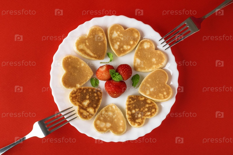 Креативный завтрак на День святого Валентина. Блинчики в форме сердца с клубникой на тарелке с вилками, на красном фоне. День святого Валентина фон. Вид сверху. Плоская укладка. Копировать пространство