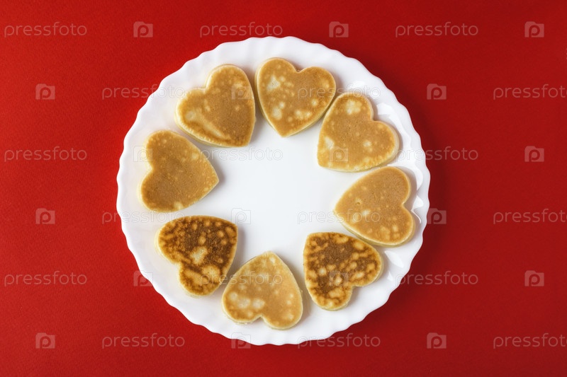 Креативный завтрак на День святого Валентина. Блинчики в форме сердца на белой тарелке, на красном фоне. День святого Валентина фон. Вид сверху. Плоская укладка. Копировать пространство