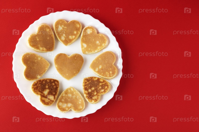 Креативный завтрак на День святого Валентина. Блинчики в форме сердца на белой тарелке, на красном фоне. День святого Валентина фон. Вид сверху. Плоская укладка. Копировать пространство