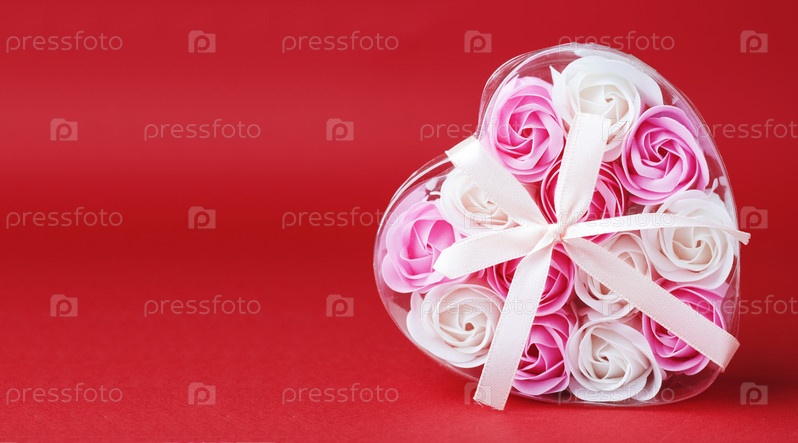 Коробка в форме сердца, полная розовых мыльных цветов, изолированных на красном фоне. Концепция ухода за кожей, красоты, поздравительной открытки ко Дню святого Валентина или баннера. Вид сверху. Плоская укладка. Копировать пространство