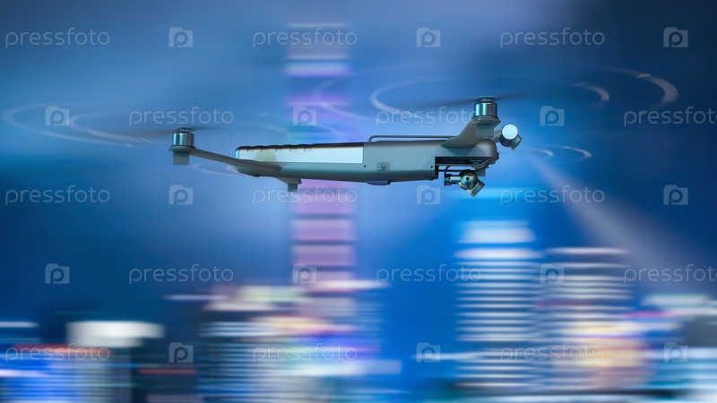 Летающий дрон. Размытый вечерний город на заднем плане. Смешанная техника