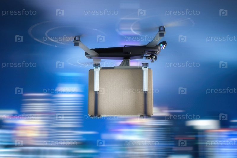 Летающий дрон переносит картонную коробку. Движение размыло вечерний город на заднем плане. 3D-рендеринг