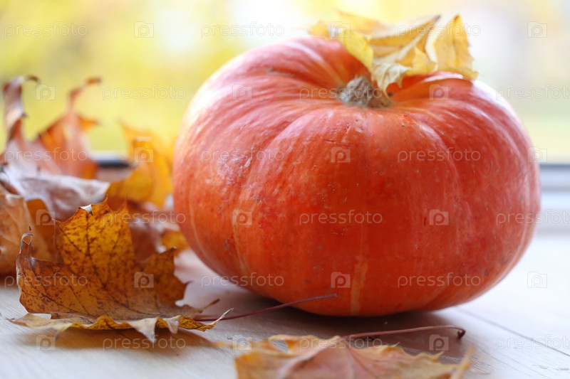 Тыква на деревянном фоне с осенними листьями