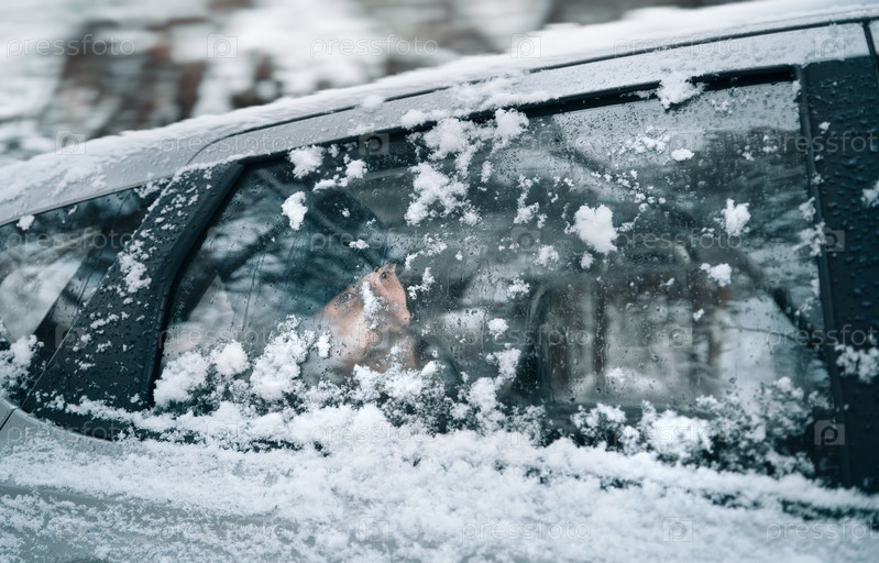 Пассажир в машине за стеклом. Зима снаружи. Сосредоточьтесь на стекле