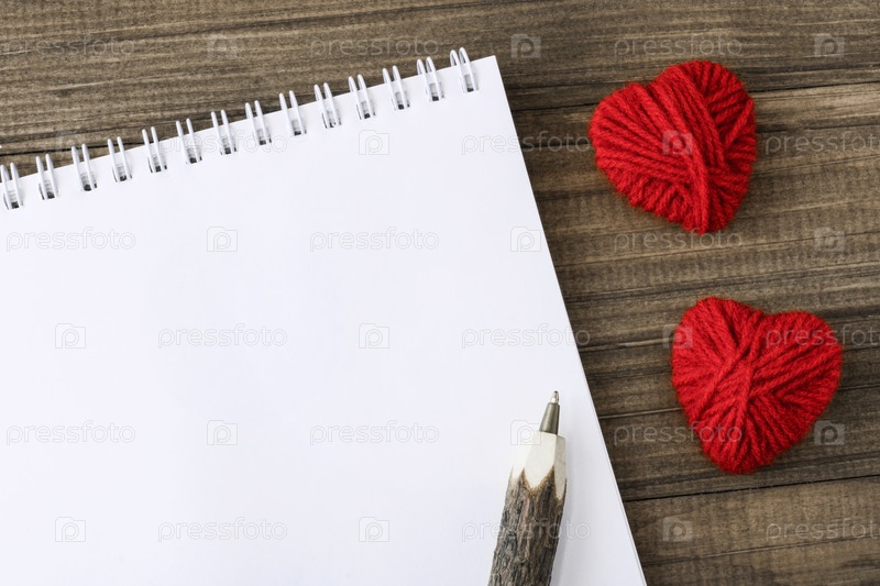 Белый лист блокнота рядом с творческими красными сердечками ручной работы, сделанными из шерстяных нитей и деревянной ручкой, на натуральном деревянном экологически чистом фоне. Концепция дня святого валентина, любовь к природе. Копировать пространство