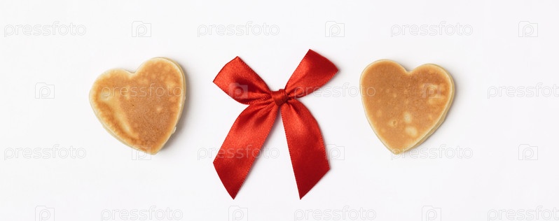 Креативный завтрак на День святого Валентина. Блинчики в форме сердца на белом фоне возле красного атласного банта. День святого Валентина фон. Вид сверху. Плоская укладка. Копировать пространство