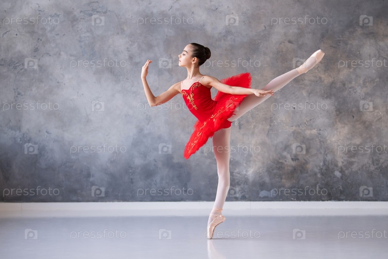 Милая маленькая девочка мечтает стать профессиональной балериной. В зале танцует девушка в ярко-красной пачке на пуантах. Ученик профессионального училища