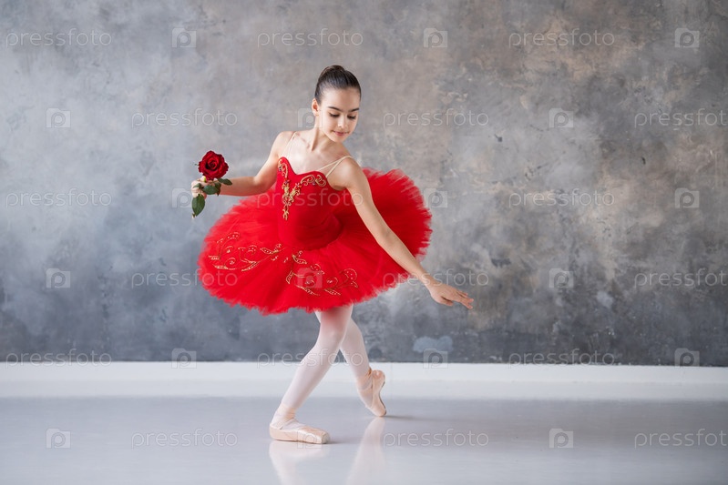 Милая маленькая девочка мечтает стать профессиональной балериной. В зале танцует девушка в ярко-красной пачке на пуантах. Ученик профессионального училища