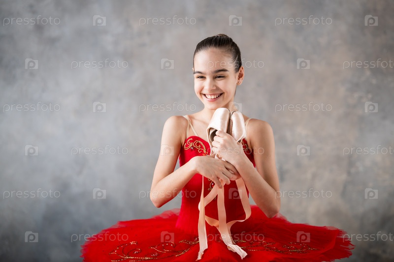 Милая маленькая девочка мечтает стать профессиональной балериной. В зале танцует девушка в ярко-красной пачке на пуантах. Ученик профессионального училища