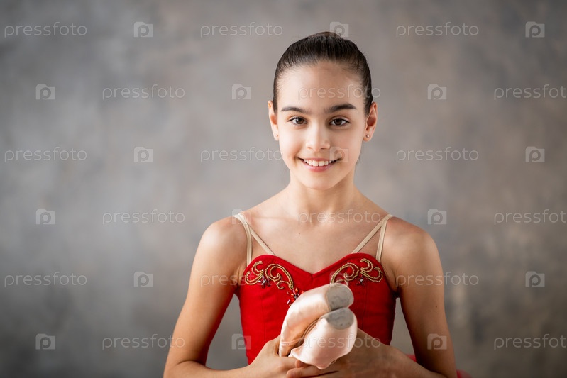 Милая маленькая девочка мечтает стать профессиональной балериной. В зале танцует девушка в ярко-красной пачке на пуантах. Ученик профессионального училища