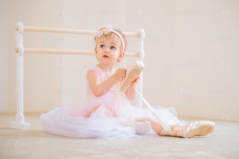 Портрет милой голубоглазой балерины в розовом, сидящей возле балетного станка и надевающей пуанты