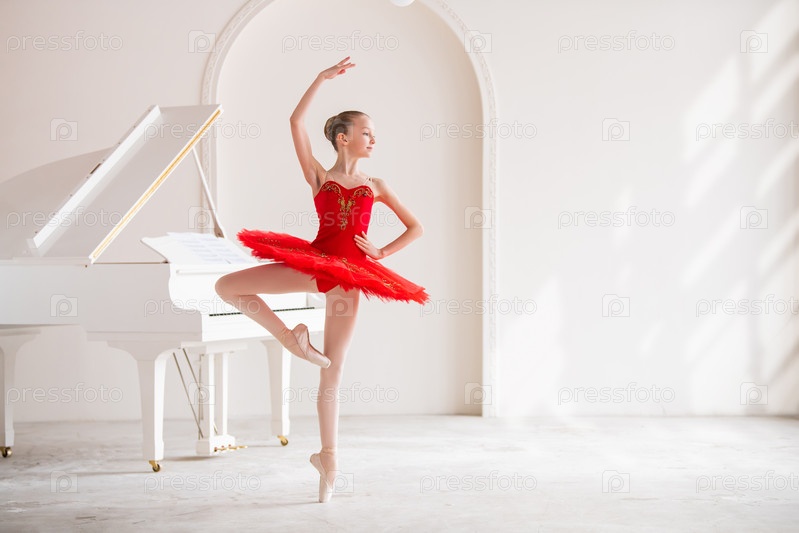 Милая маленькая девочка мечтает стать профессиональной балериной. В белой комнате, рядом с роялем, на пуантах танцует девушка в ярко-красной пачке. Ученик профессионального училища
