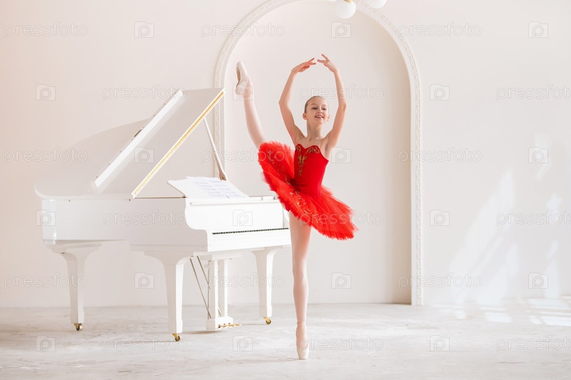 Милая маленькая девочка мечтает стать профессиональной балериной. В белой комнате, рядом с роялем, на пуантах танцует девушка в ярко-красной пачке. Ученик профессионального училища