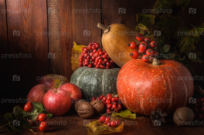 Яблоки и тыква на темном деревянном фоне в деревенском стиле