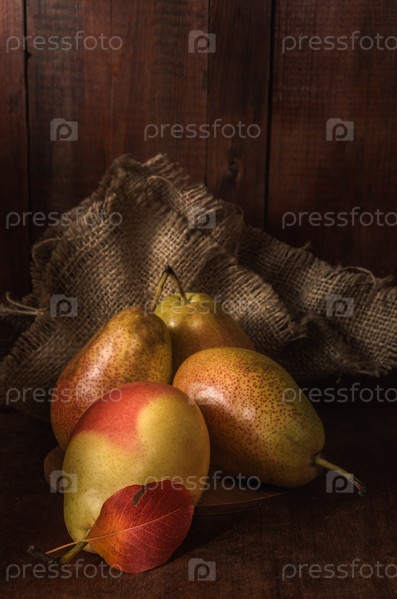Спелые груши на темном деревянном фоне в деревенском стиле