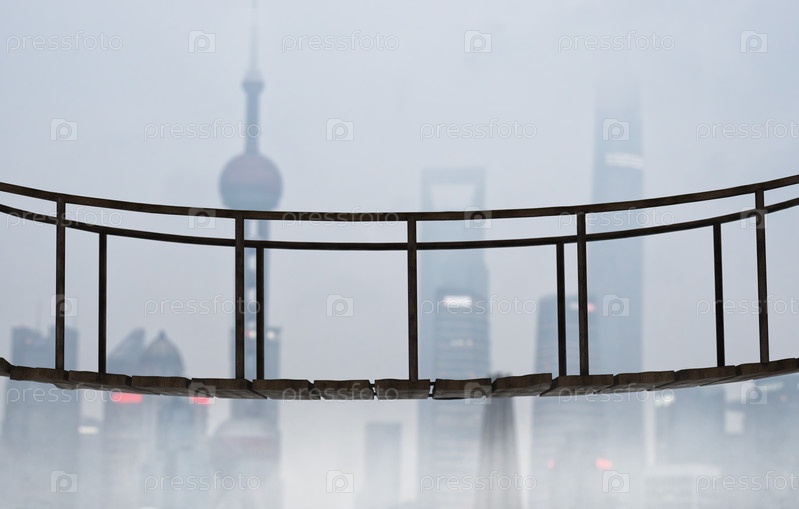 Деревянный подвесной мост. Мегаполис на заднем плане. Туманное утро