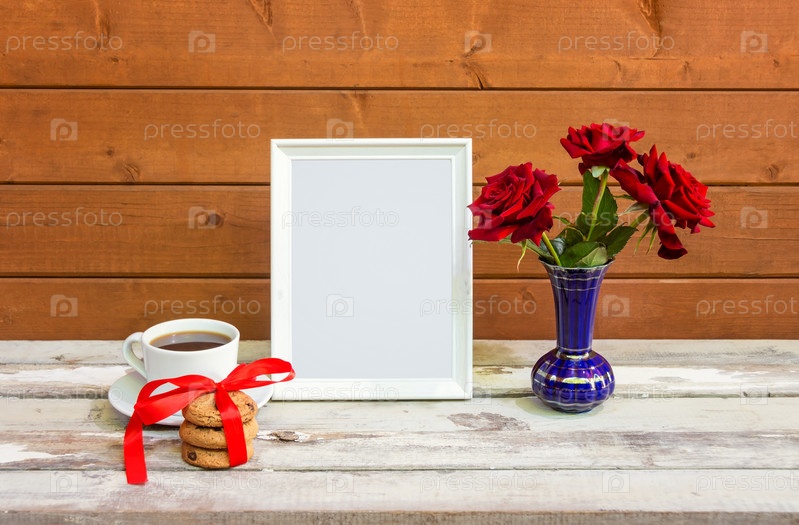Рамка, чашка кофе, печенье и красные розы на состаренном деревянном столе