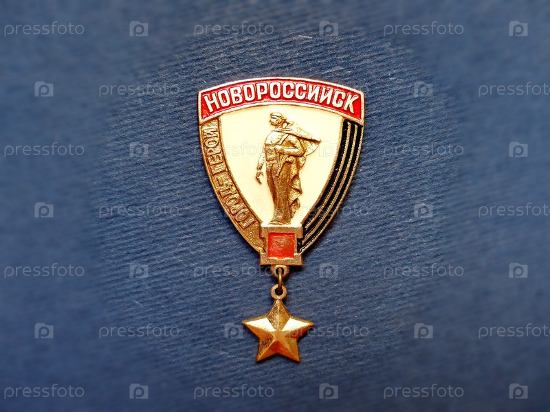 Советский металлический значок с изображением золотой звезды и надписью "город-герой Новороссийск" из серии "Города-герои СССР". Фалеристика