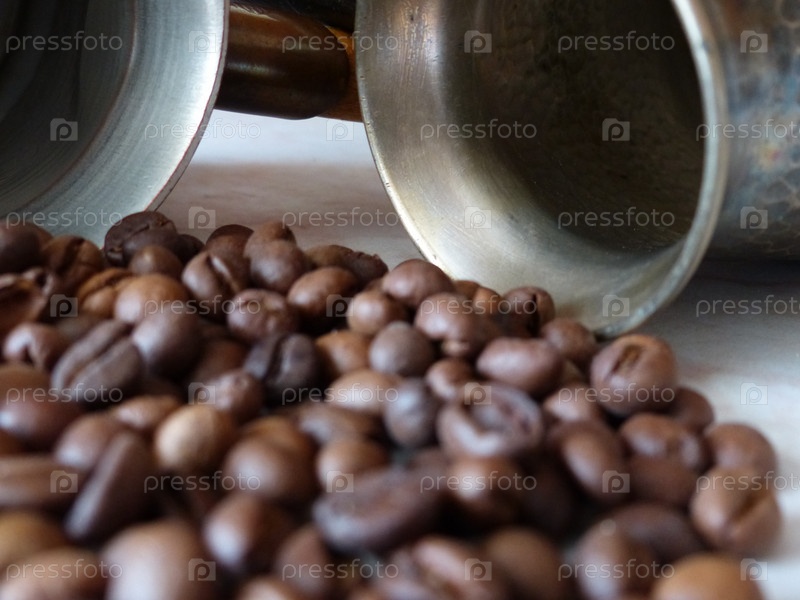Зерна обжаренного кофе на фоне лежащих медных кофеварок. Натуральный и экологически чистый продукт. Размытый фокус