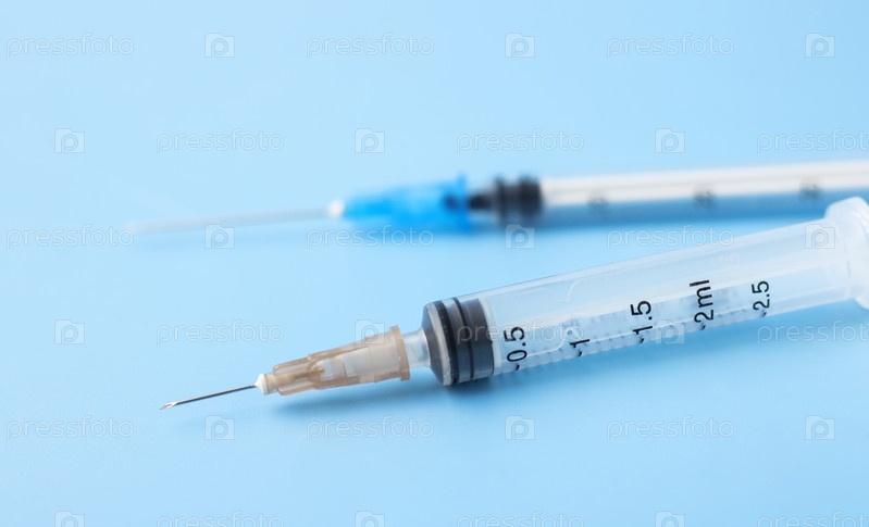 Медицинские пустые шприцы на синем фоне. Концепция медицины, здравоохранения и вакцинации. Копировать пространство