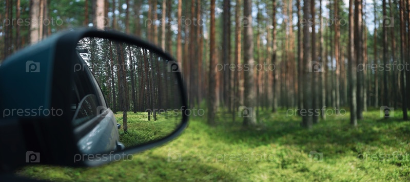 Вид из окна машины на лес. Выборочный фокус