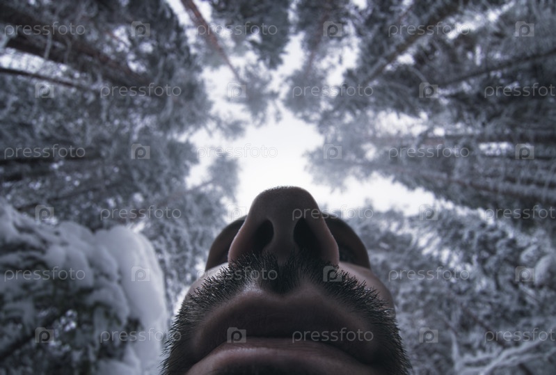 Портрет древнего человека в зимнем лесу. Вид снизу