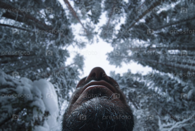 Снежный человек в зимнем лесу. Вид снизу. Сосредоточьтесь на подбородке