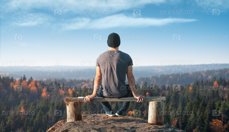 Мужчина сидит на скамейке и лицезреет живописным видом на тайгу