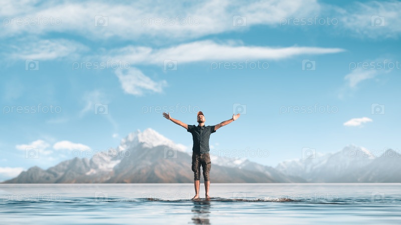 Мужчина вздымающий руки. Он стоит на отмели в горном озере. Горный пейзаж на заднем плане