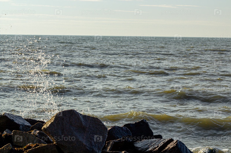 Красивый морской берег с волной и большими камнями, волны разбиваются о скалы